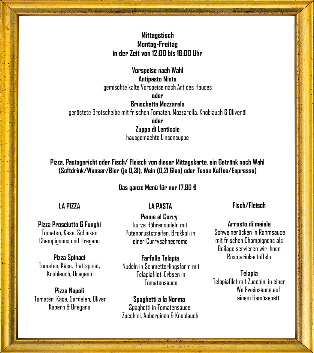 Mo - Fr von 12-16 Uhr Vorspeise, Hauptgericht und ein Getränk nach Wahl nur 17,90 €
